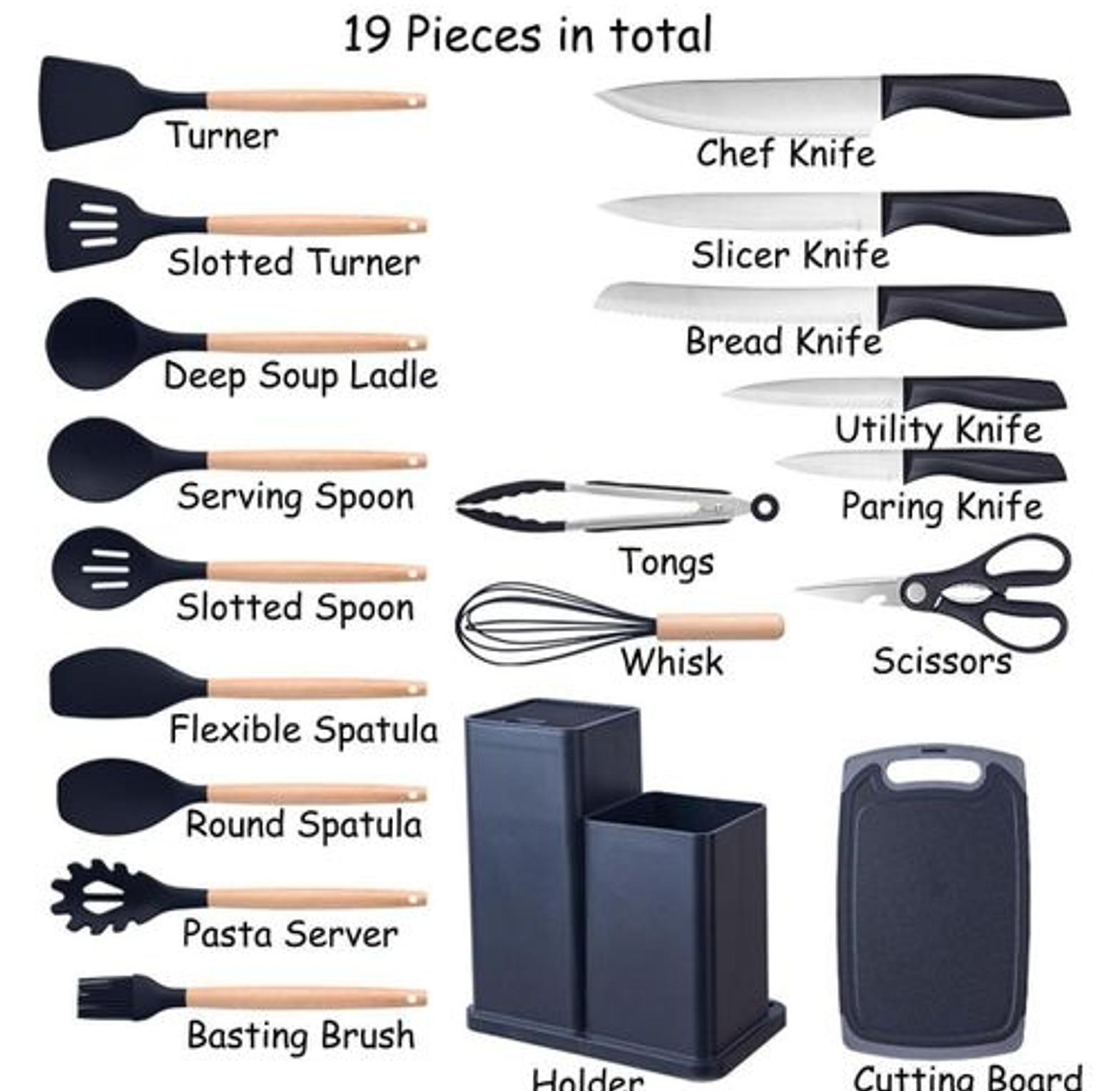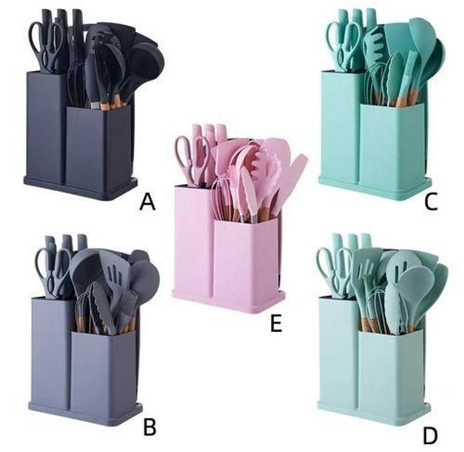 KEY FEATURES 1. High-quality silica gel: Silicone kitchenware set is made of environmentally-friendly silicone safe and non-toxic materials. 2. Silicone has high strength and softness and it does not hurt the pan. 3. Wooden handle: Elm handle easy to grasp. 4. Wide temperature range cold and high temperature resistance. The temperature range [min. 40] to 230 degrees Celsius. 5. Recyclable and durable.