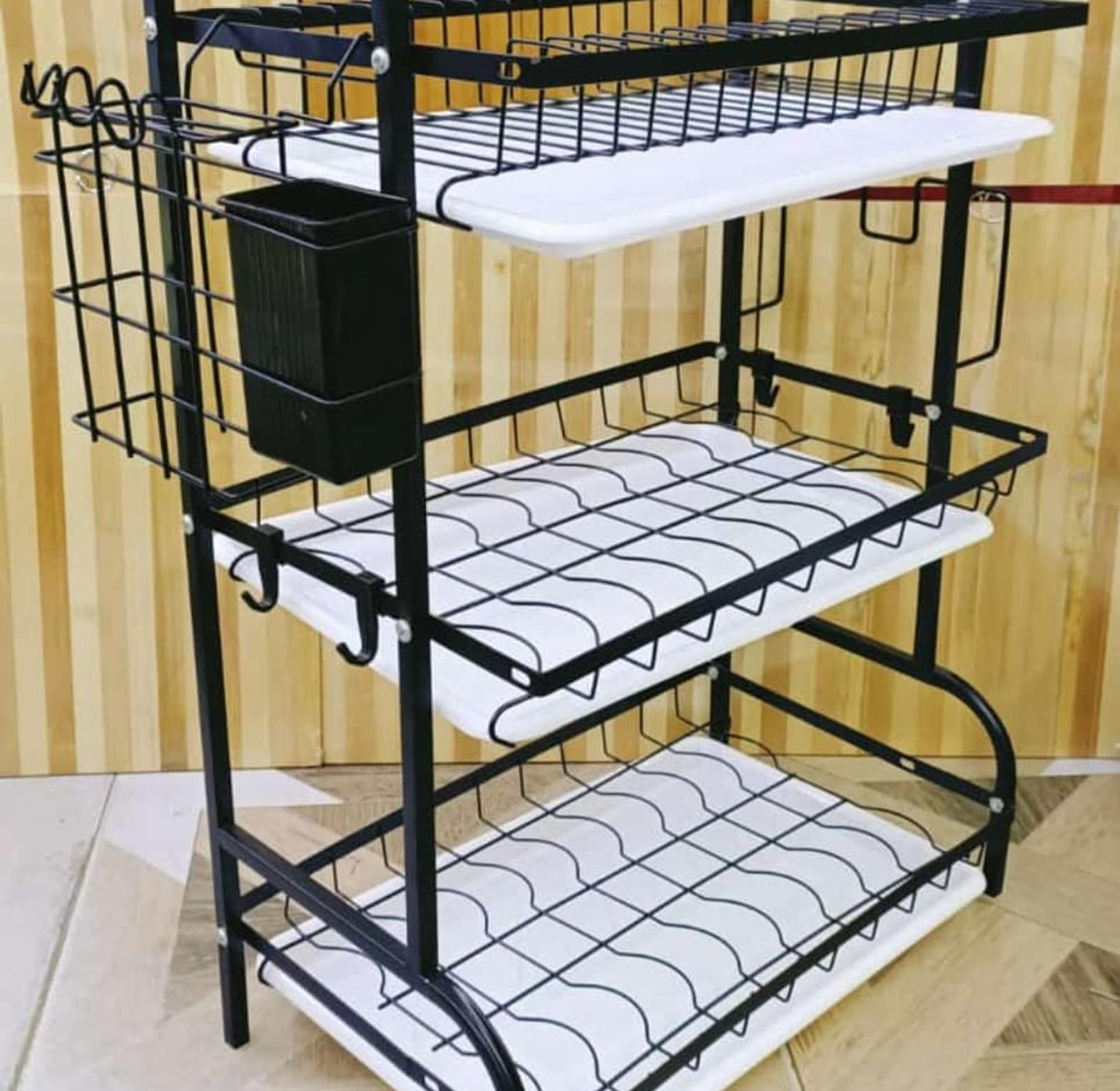 3 tier dish rack Made with heavy-duty stainless steel, long-lasting- Decent size, capable of holding quite a large number of dishes, utensils & cutting board. - Compartments can be arranged to suit your needs. - The drainboard keeps the countertop clean and tidy - Anti-slip feet to avoid dish rack moving on the countertop. - Everything can be disassembled and washable to keep the dish rack clean.