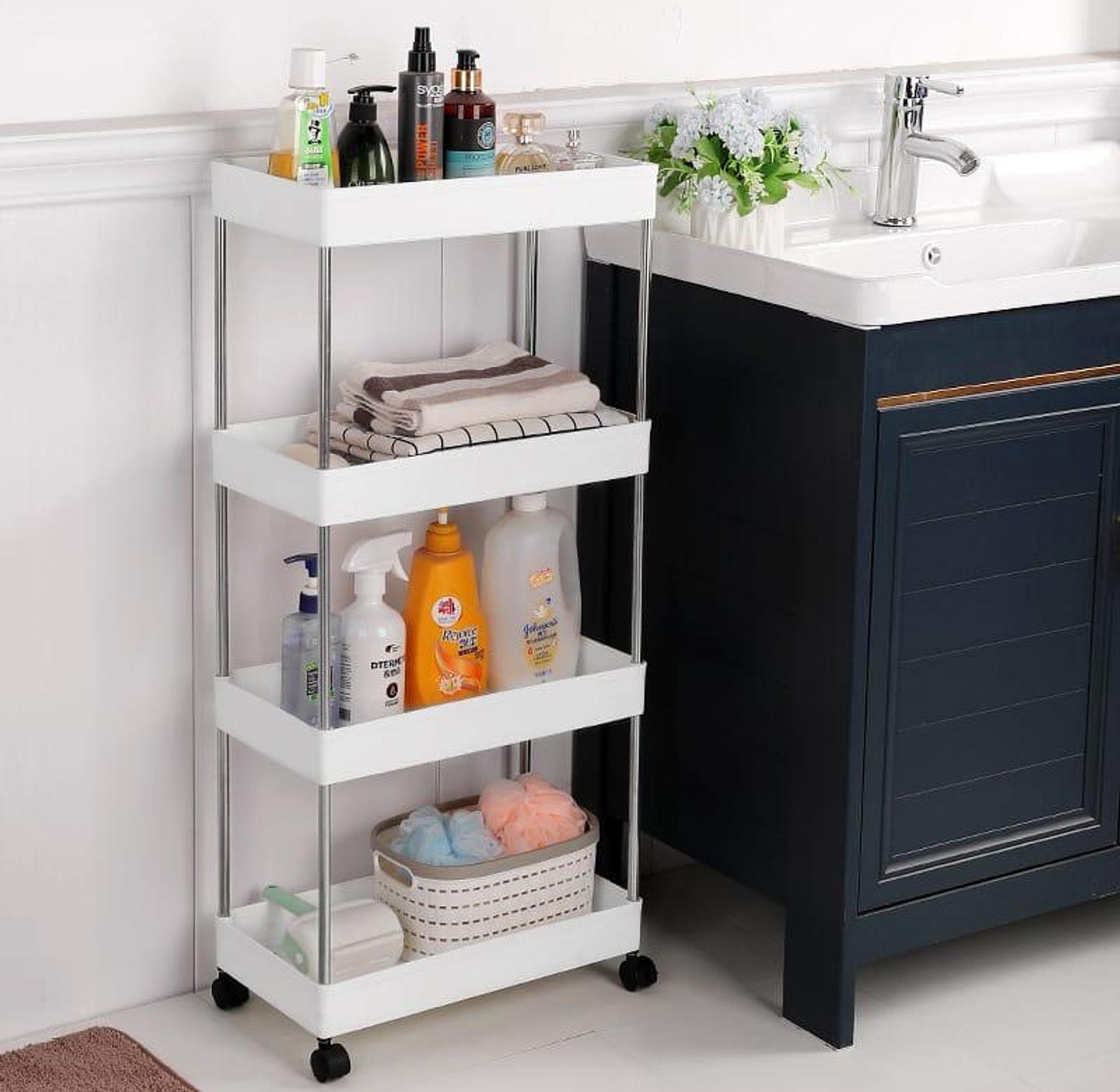 KEY FEATURES Key Features upright stand design easy to assemble large storage space 4 layer shelves upright stand design easy to clean perfect for bath organization easy to assemble large storage space 4 layer shelves