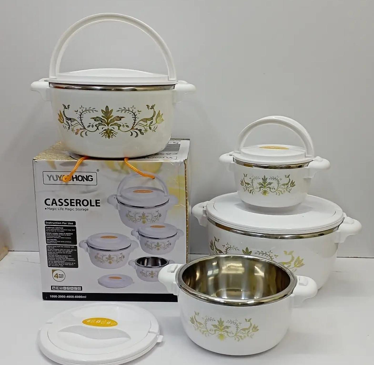 Key Features 4 Pieces Insulated Hot Pots Casserole Set Comfortable carrying during travel,picnics etc Freshness Redefined - Retain aroma, taste & nutrition Intact locking system Thick polyurethane insulation keeps food hot and fresh for 4-6 hours No need to microwave your food. 1000 ml, 2000 mls ,4000 mls ,6000mls