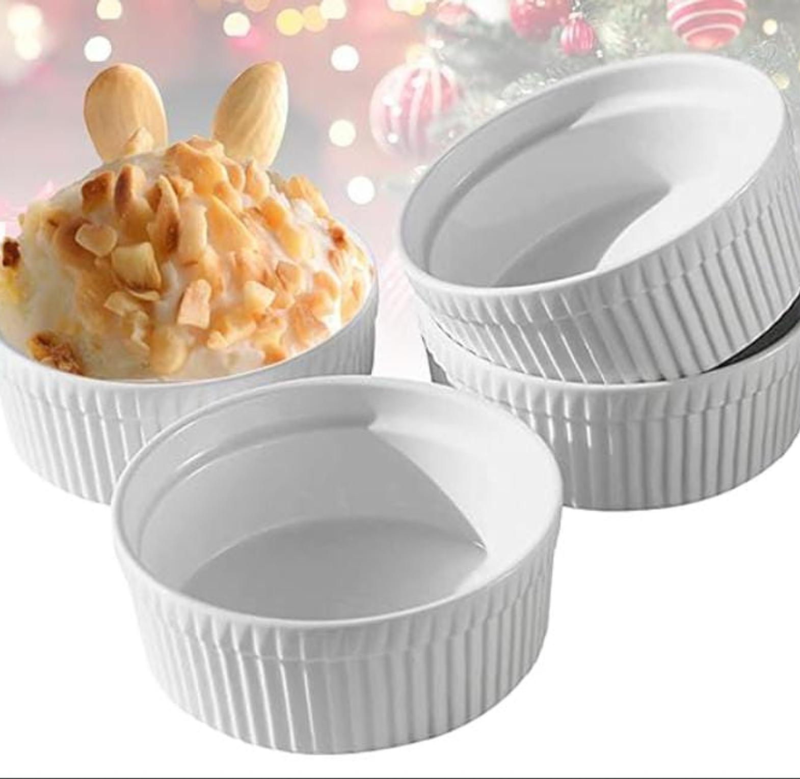 KEY FEATURES Dessert bowl 3.5" , each ceramic soup bowl has a maximum liquid capacity of up to 24 ounces with smooth edges. Not only do they work well as onion soup, chili, grain, and cheese soup, but they also make an ideal bowl for snacks, rice, and noodles. Professional Ceramics: Dessert bowl 3.5" are made of professional durable porcelain, high quality ceramics, high temperature resistant, safe and odor-free, dishwasher, microwave, oven, and refrigerator safe. Classical Design: The classic plain white french onion soup crock is a great companion to any dining table, it also makes food look more palatable and attractive, and is great tableware to enhance your kitchen decor. They can also be used for various party holidays, such as Halloween, and Christmas Day. Save Space: Our onion soup bowls are stackable, so you won't waste your kitchen space and say goodbye to messy cupboard space. Stable and not prone to tipping, these ramekins large onion soups are stain-resistant and easy to clean.