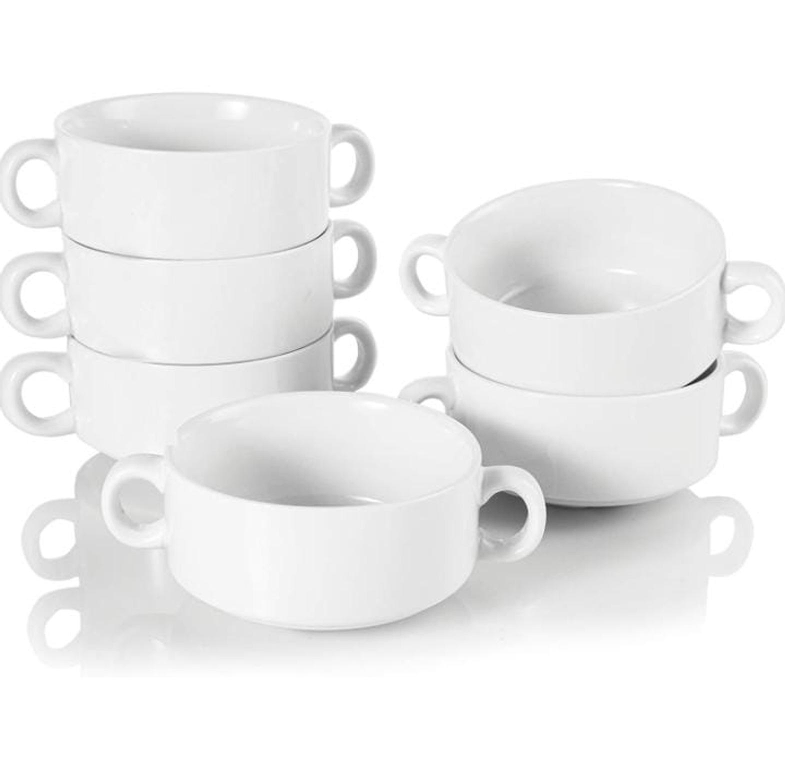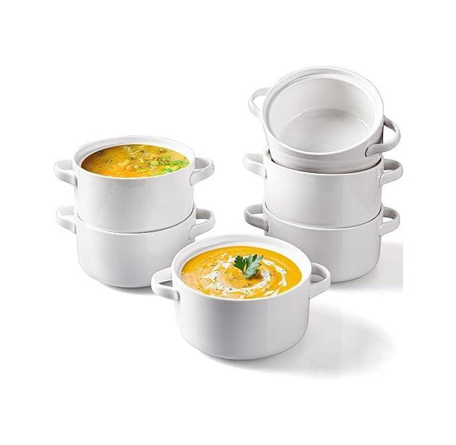 KEY FEATURES Versatile Soup Bowl Set: 5"w * 2.8" h, each ceramic soup bowl has a maximum liquid capacity of up to 24 ounces with smooth edges. Not only do they work well as onion soup, chili, grain, and cheese soup, but they also make an ideal bowl for snacks, rice, and noodles. Sturdy Handle Design: The porcelain soup crock has two handles to balance the weight, the handles will not get hot when taking hot dishes, and it is also easy to take out from the microwave. The vertical open-loop handle lifts and drinks liquids, and can also be tilted to collect the last bit of liquid. Professional Ceramics: Delling soup bowls with handles are made of professional durable porcelain, high quality ceramics, high temperature resistant, safe and odor-free, dishwasher, microwave, oven, and refrigerator safe. Classical Design: The classic plain white french onion soup crock is a great companion to any dining table, it also makes food look more palatable and attractive, and is great tableware to enhance your kitchen decor. They can also be used for various party holidays, such as Halloween, and Christmas Day. Save Space: Our onion soup bowls are stackable, so you won't waste your kitchen space and say goodbye to messy cupboard space. Stable and not prone to tipping, these ramekins large onion soups are stain-resistant and easy to clean.