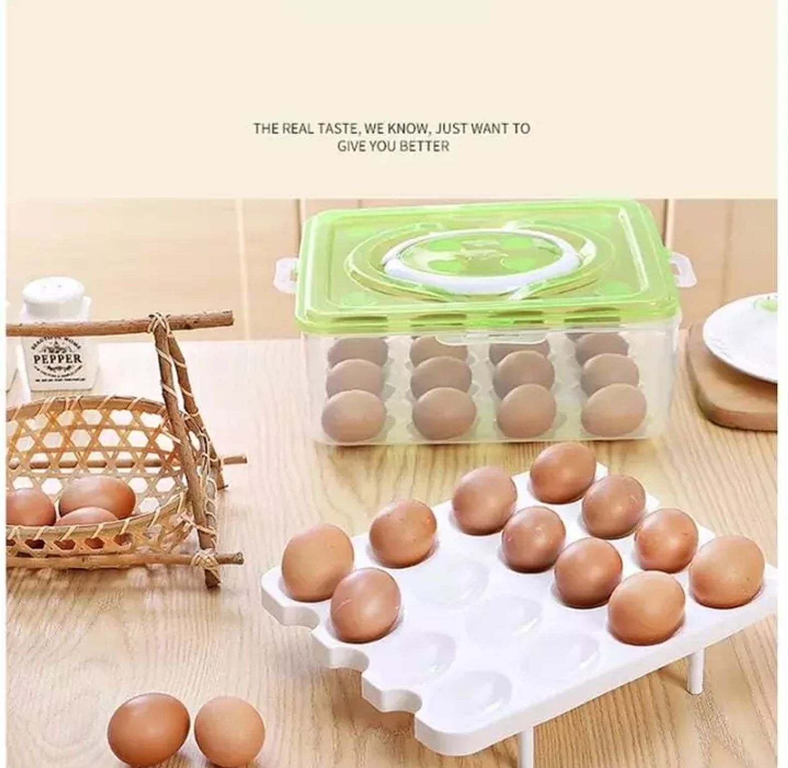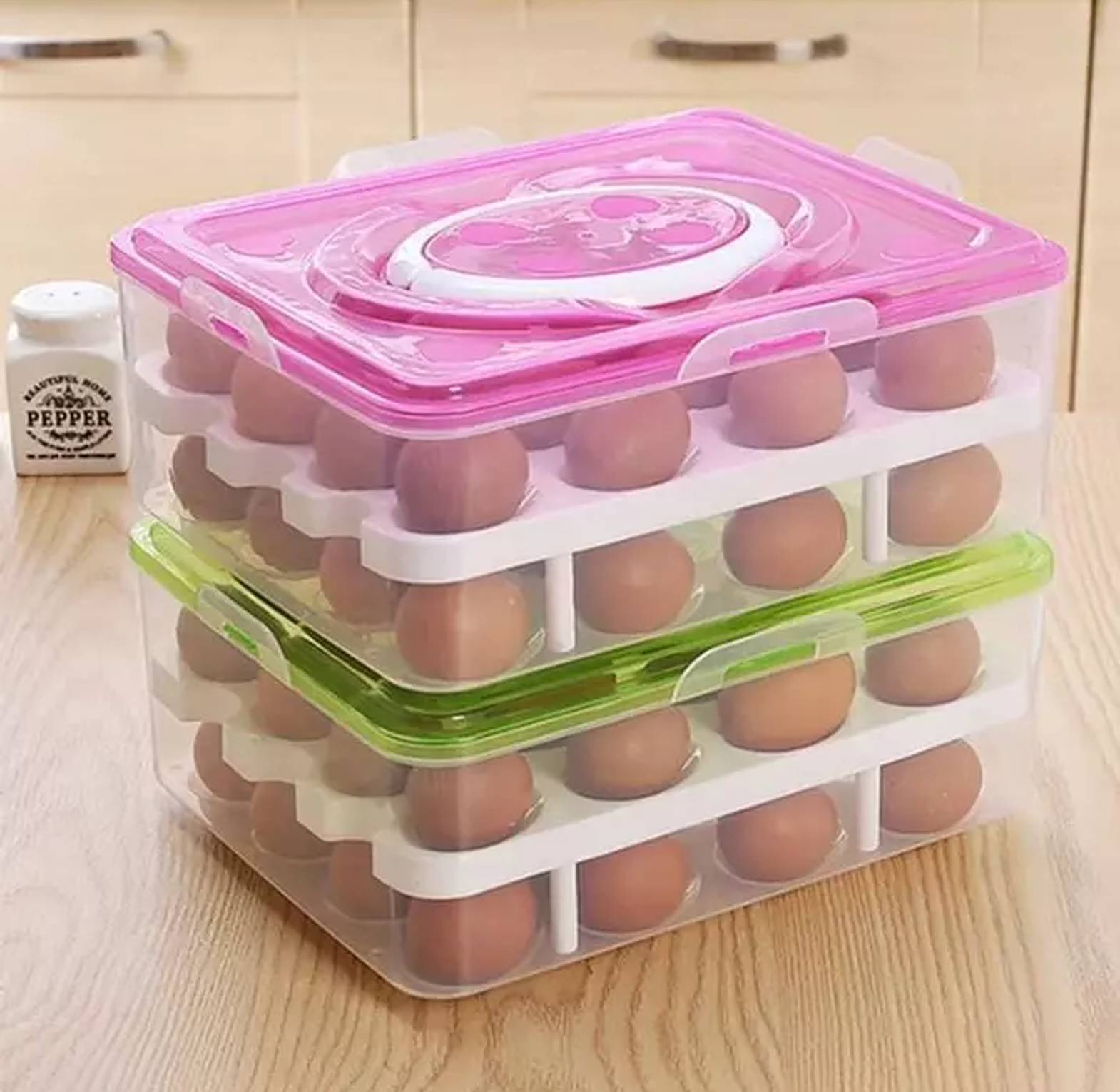 The 32-Hole Egg Tray is a sturdy and spacious storage solution designed to securely hold and organize up to 32 eggs, keeping them fresh and protected in your kitchen or refrigerator.