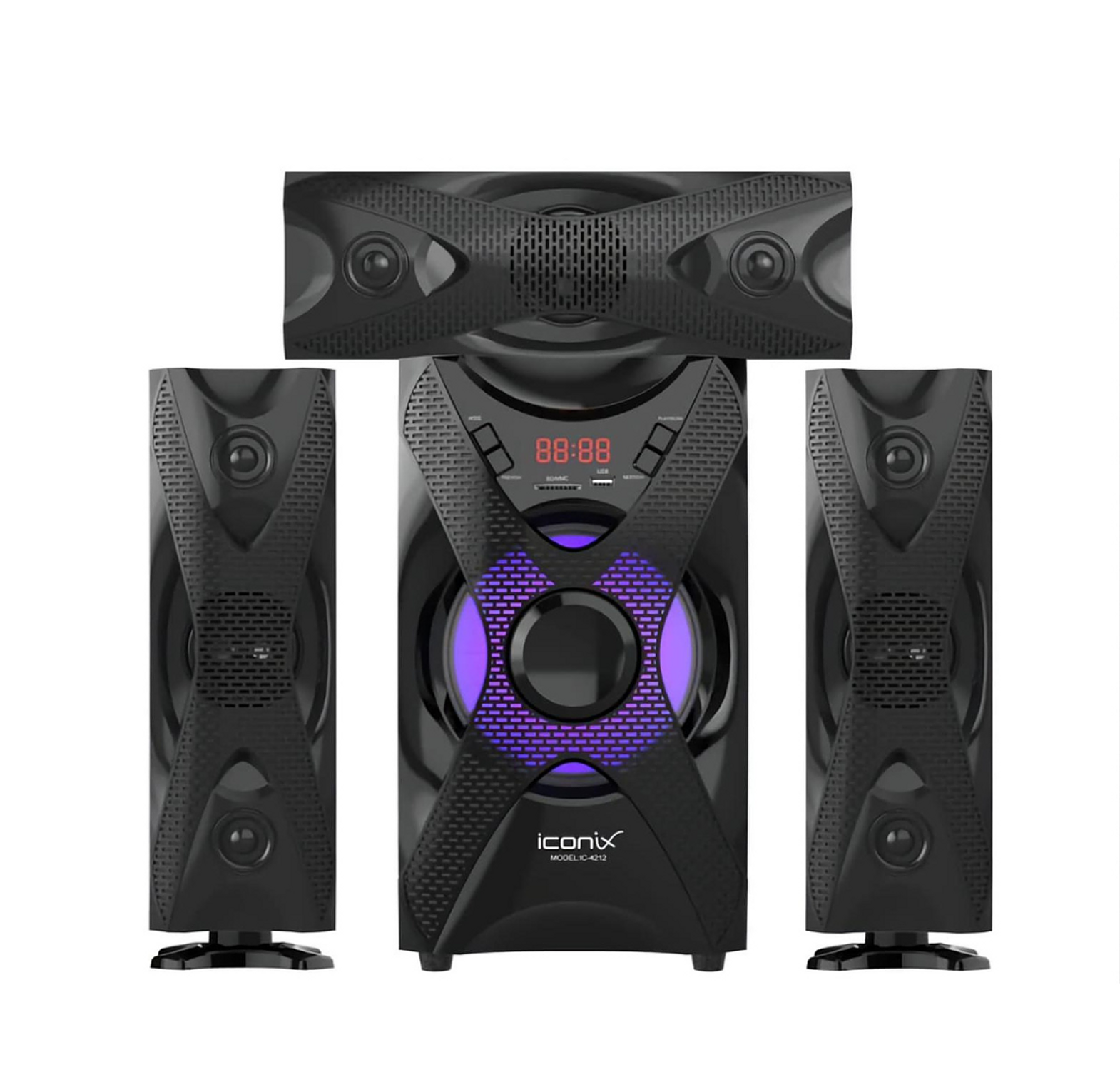 The Iconix IC-4212 3.1 CH Super Bass Sound System delivers an immersive audio experience with deep bass, Bluetooth connectivity, USB support, and FM radio, perfect for any music lover.