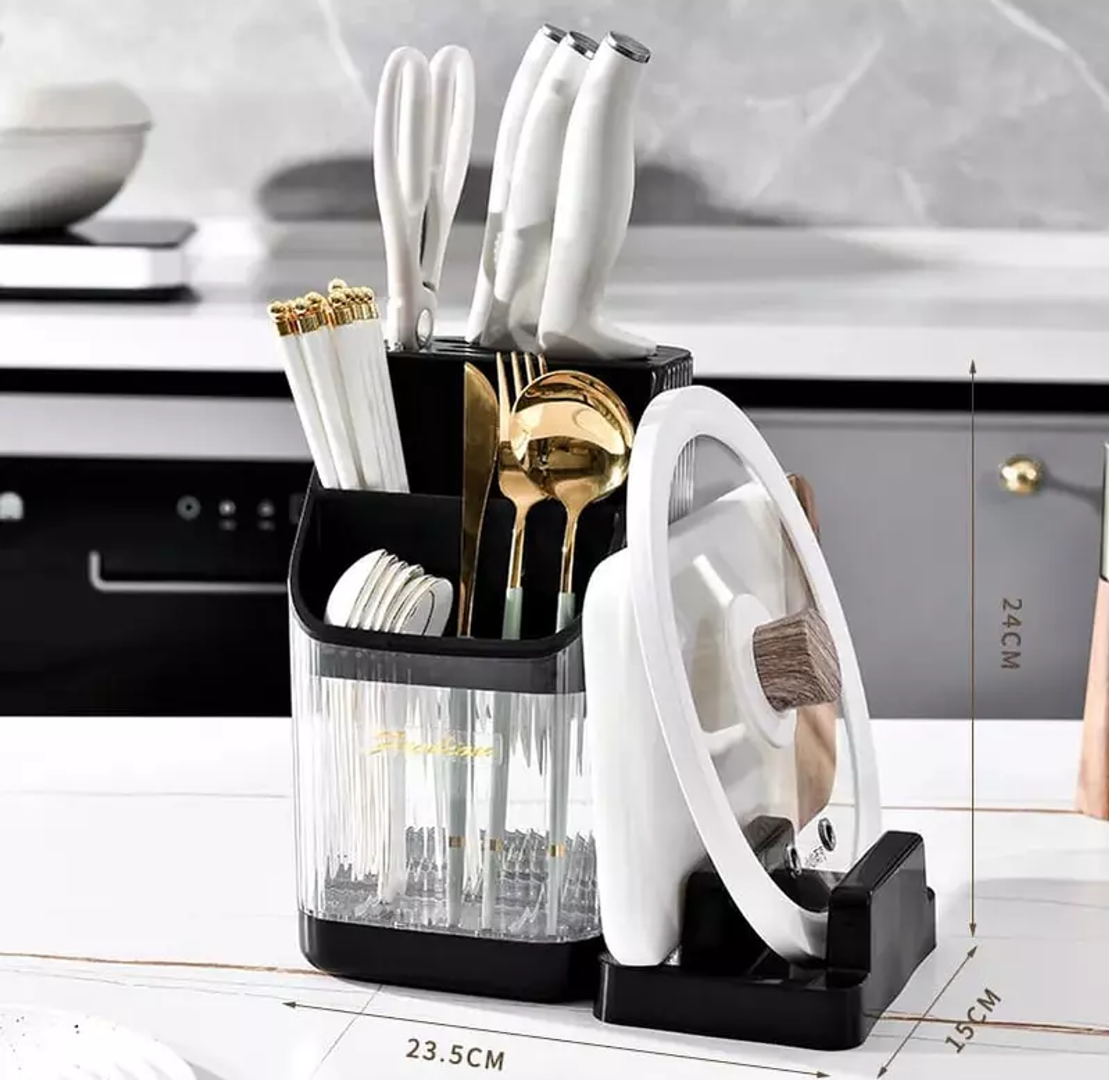 The Kitchen Multifunction Cutlery Storage Organizer with a detachable chopping board and pot lid holder is a space-saving solution designed for efficient kitchen organization and convenience.