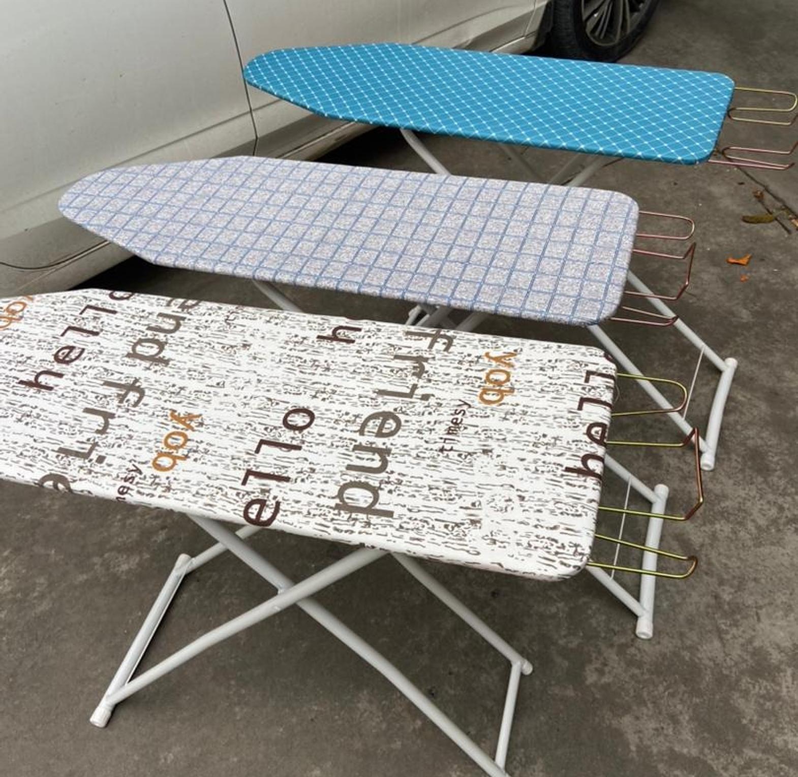 A sturdy and stylish metallic ironing board, designed to provide a smooth, durable surface for all your ironing needs while saving space in your home.