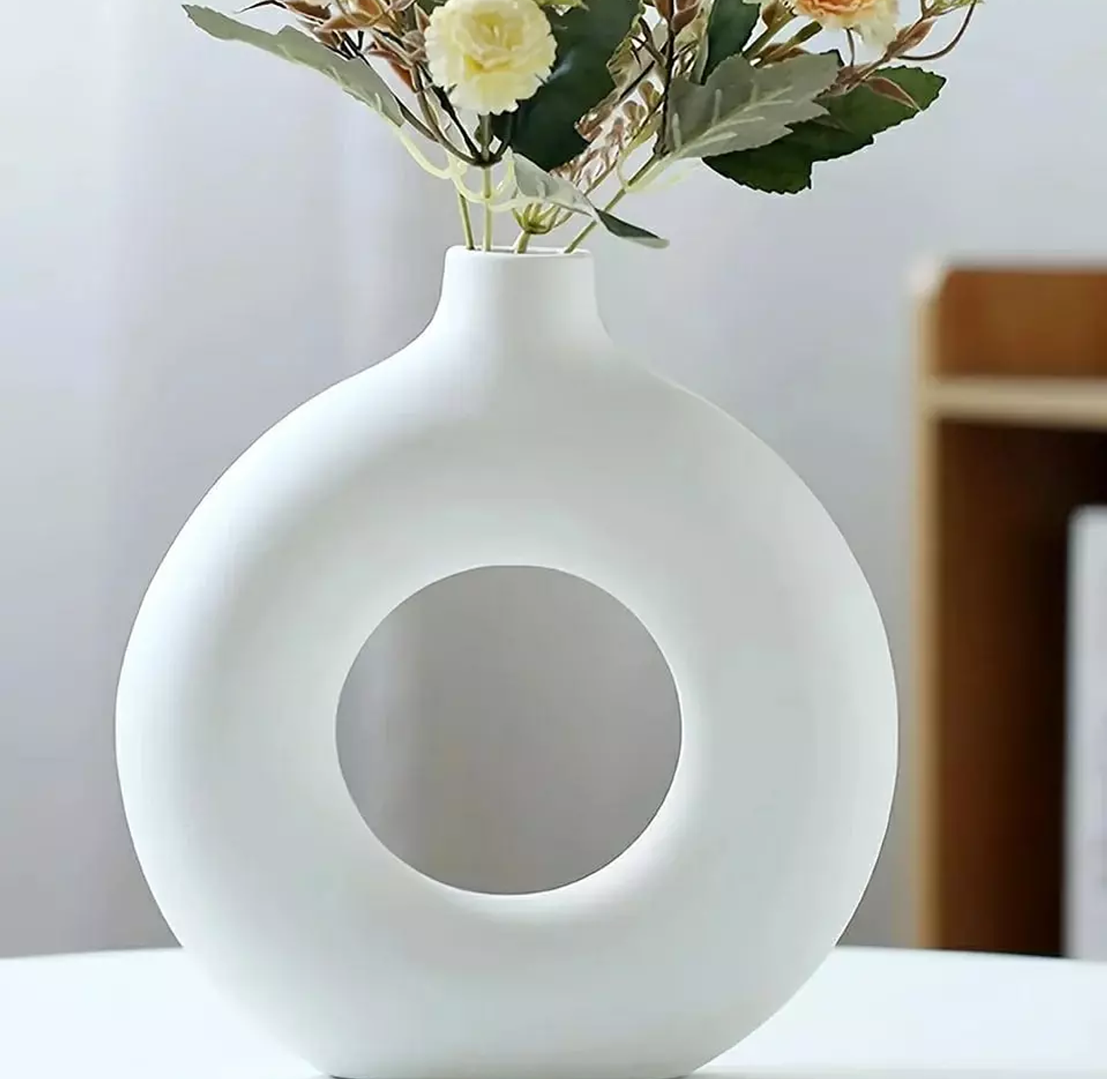 The Nordic Ceramic White Doughnut-Shaped Vase is a sleek and modern decorative piece with a minimalist hollow design, perfect for enhancing any contemporary home décor.