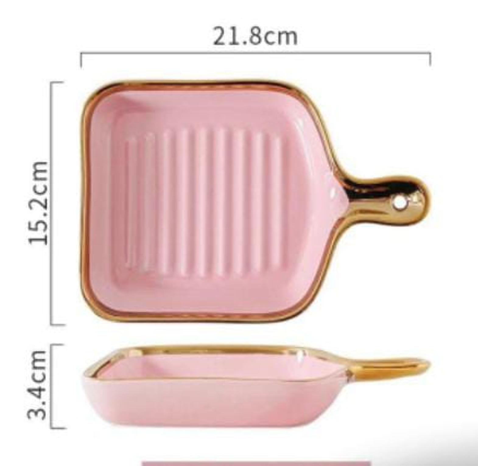 KEY FEATURES Material: High-fired ceramic, food safe. Size:8.8 X 6.3 X 1.1 Inch Package includes:1 PCS 8.5 inch baking plate with single handle. Perfect for dinner, party, wedding, birthday, Christmas, Easy to clean, not safe in microwave.