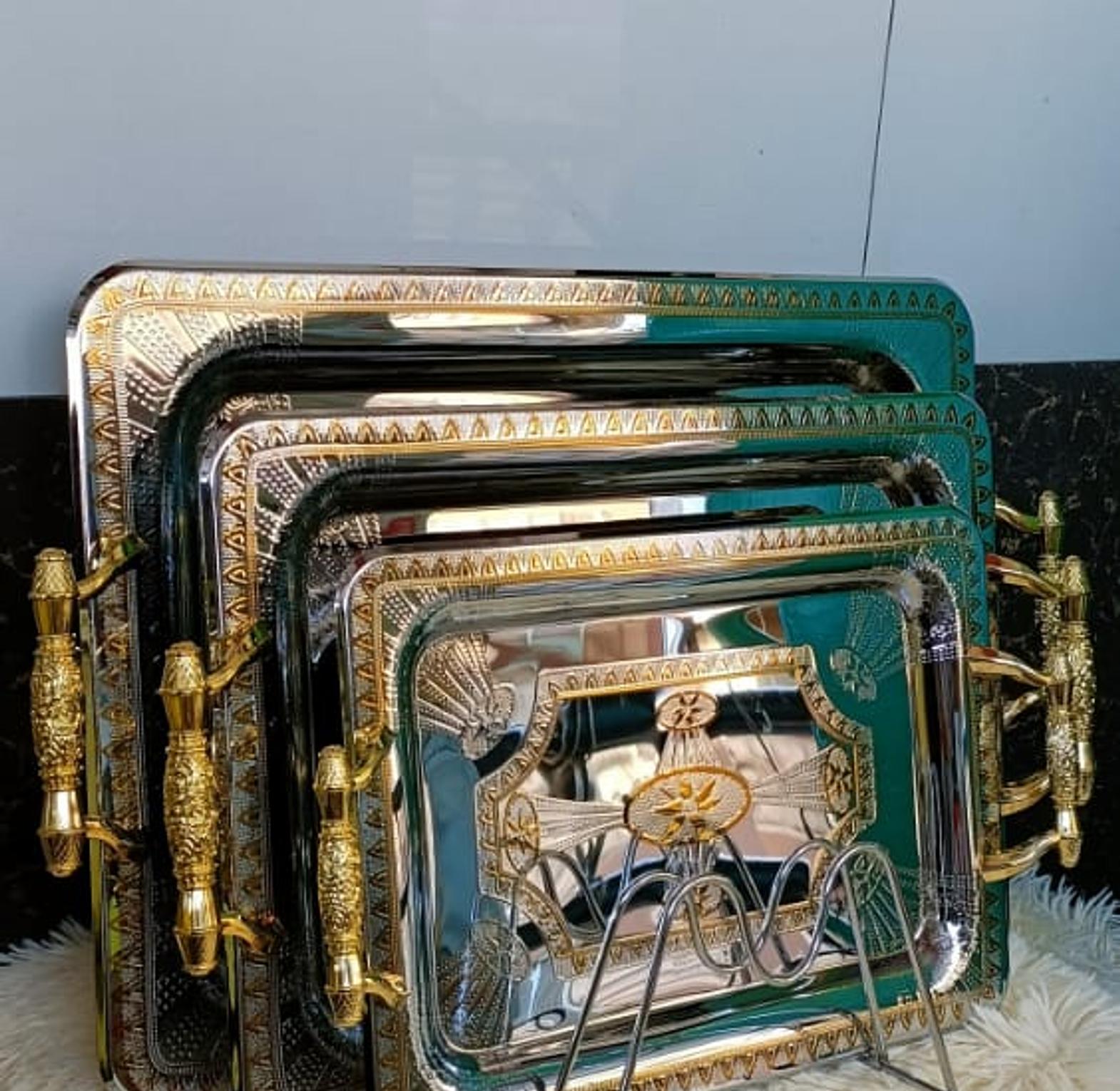 KEY FEATURES Material: Stainless Steel Type: Serving Tray Corrosion-resistant Durable and Lightweight 3 Tray Sizes- Three different tray sizes included to serve various needs.