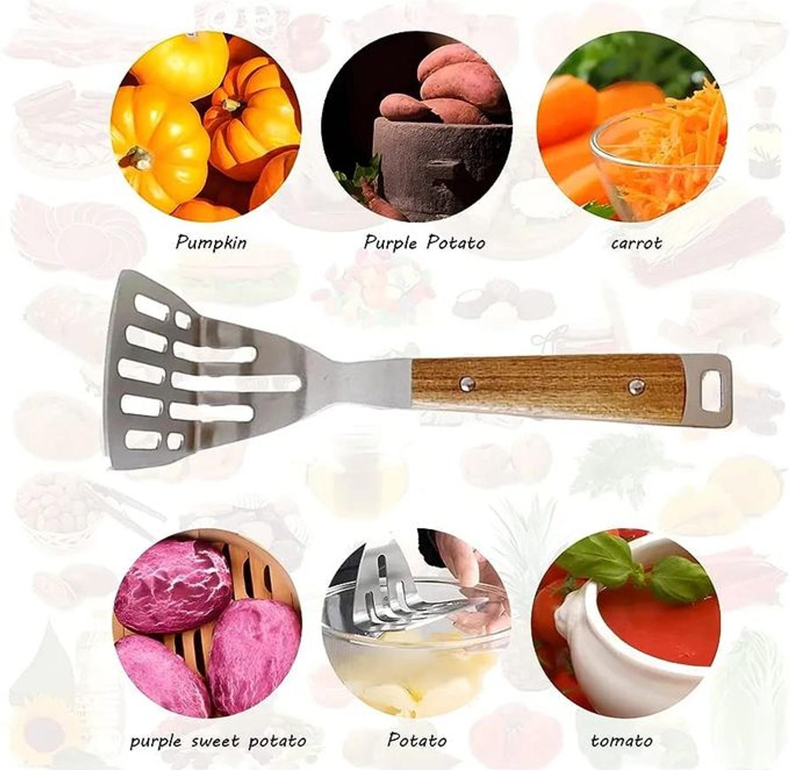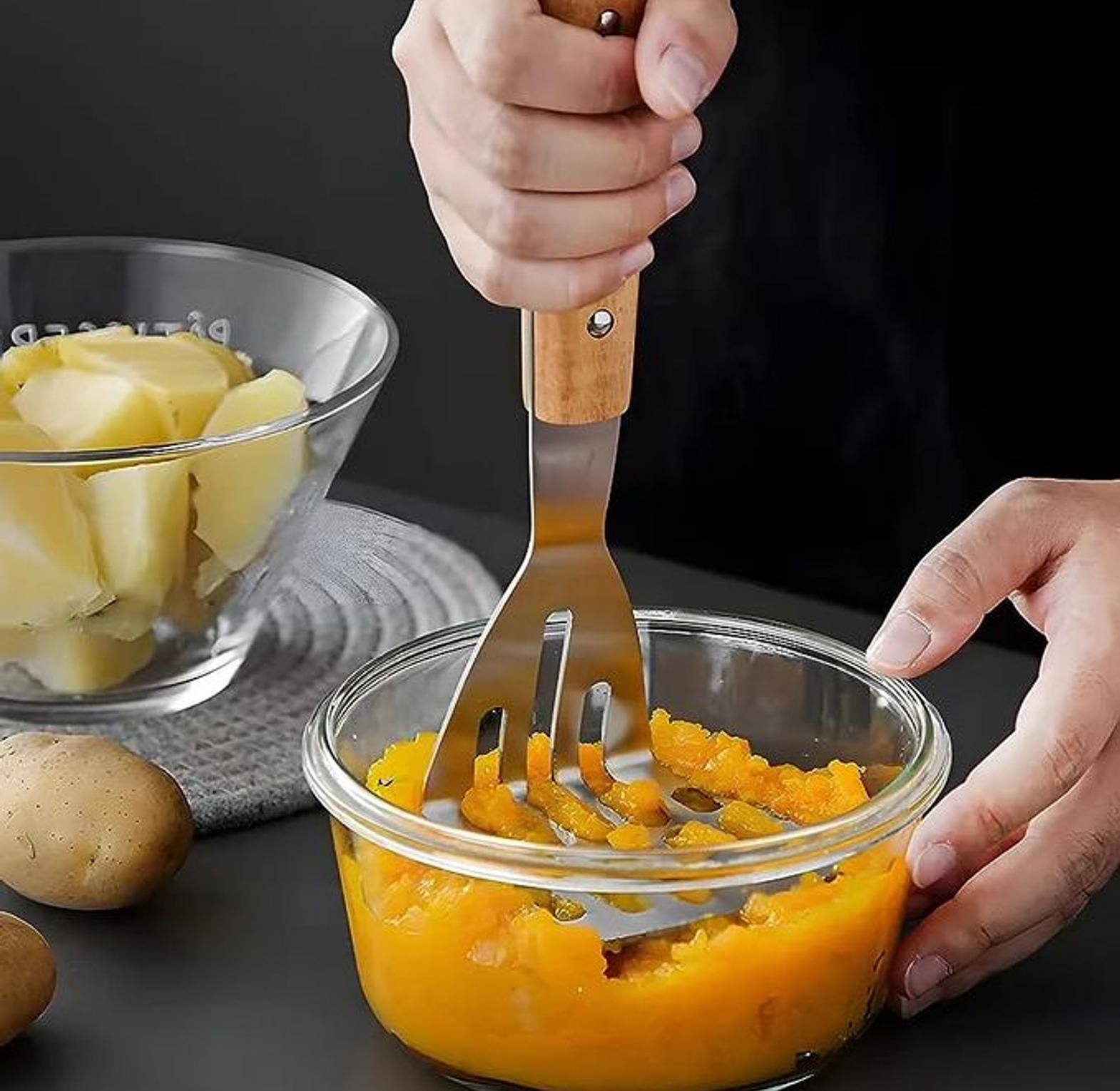 KEY FEATURES Efficiently mashes cooked potatoes, purple potatoes, sweet potato, carrots & bananas - Mashes food to a fine consistency Custom-designed nonslip handle is well-balanced & ergonomically designed for comfort & smooth operation under heavy use Features mechanism that locks head securely in place & folds flat for easy storage when not in use Crafted of high quality rustproof stainless steel,