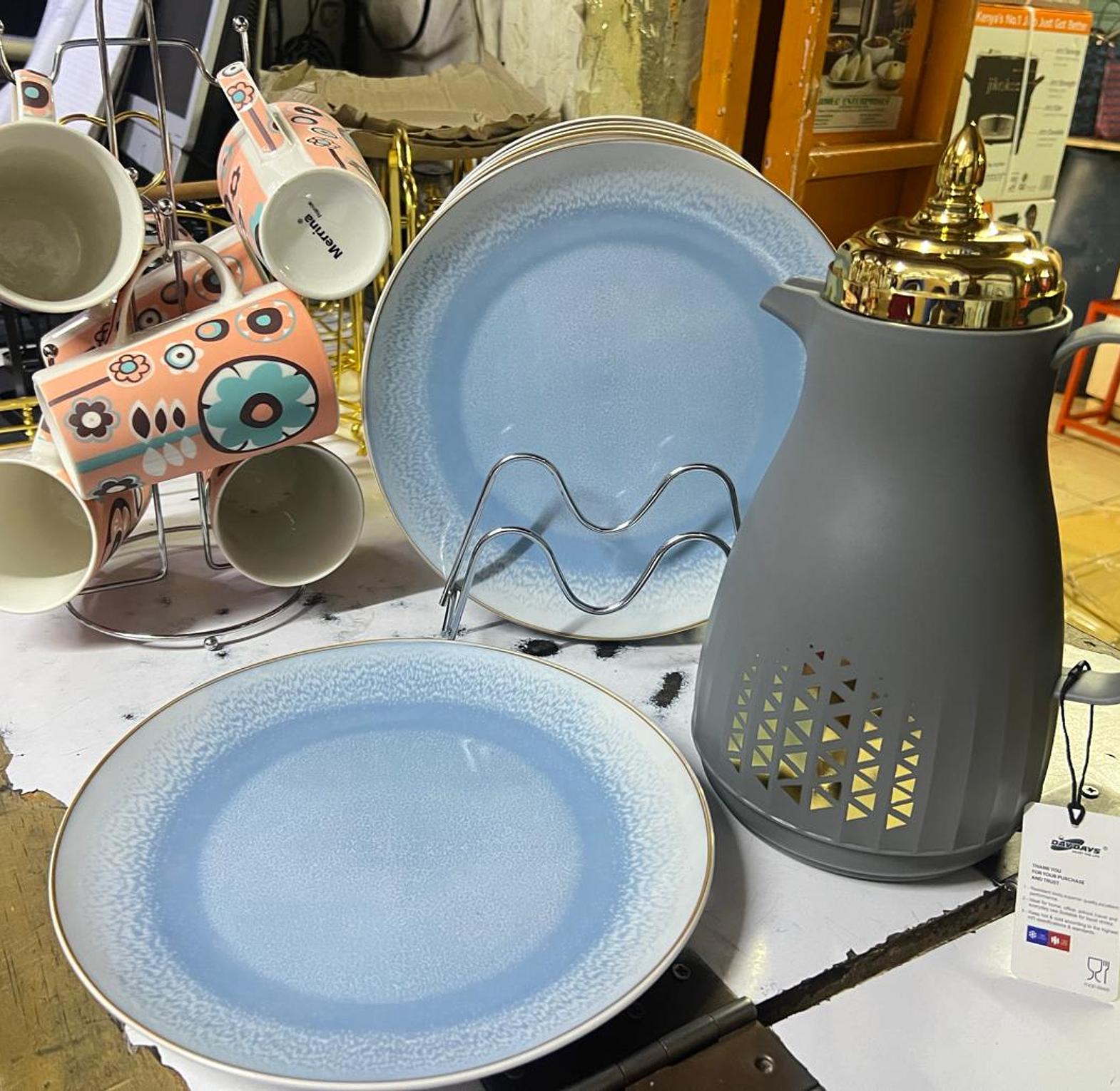 6 pcs blue ceramic plates , 6 pcs orange/white mugs and grey gold flask