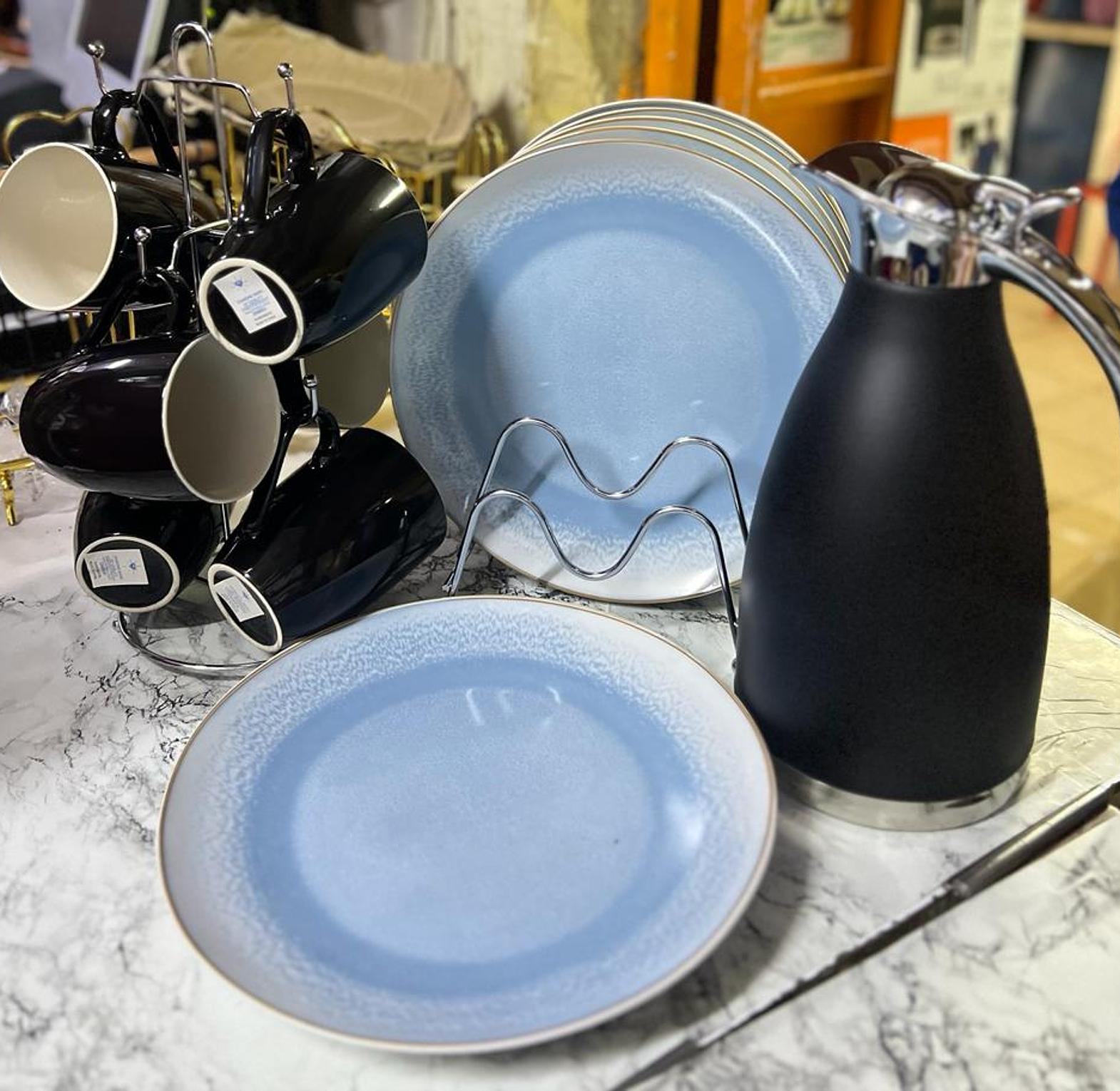 6 pcs blue plates,6 pcs black/white mugs , 2 ltr black flask