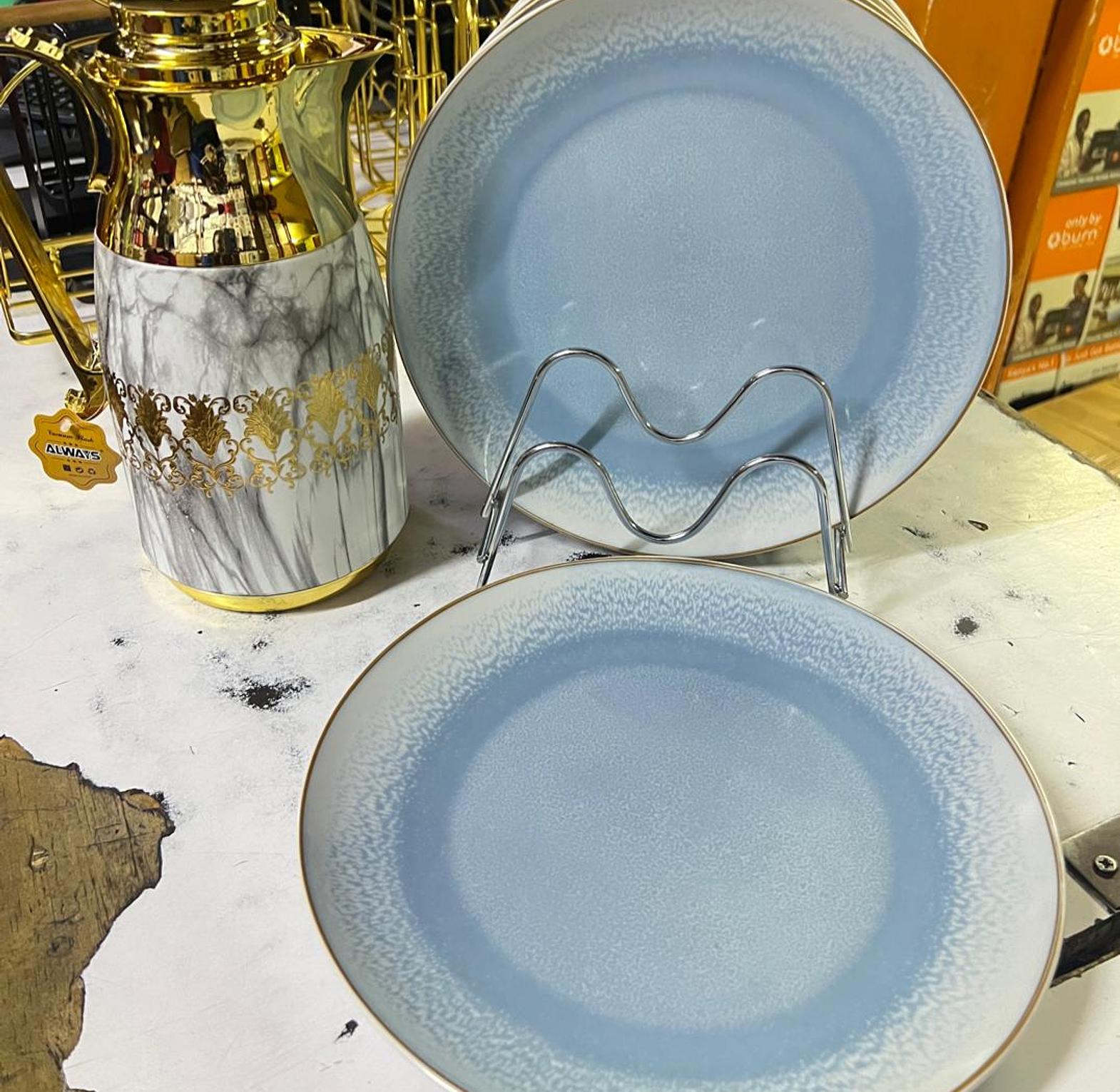 6 pcs ceramic diner plates blue 10.5 inch and 1 ltr flask black