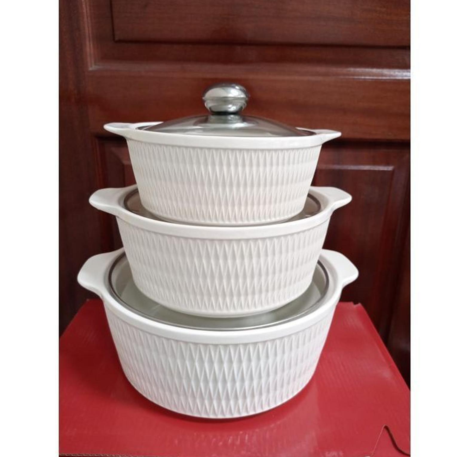 Three-piece ceramic serving dish set with glass covers (3 liters, 2 liters, and 1.5 liters) · Versatile use for prep, salad, pasta, soup, and more · Lid ensures food remains fresh and warm · Microwave, dishwasher, oven, and freezer safe · Stackable design saves space and features anti-scratch glaze