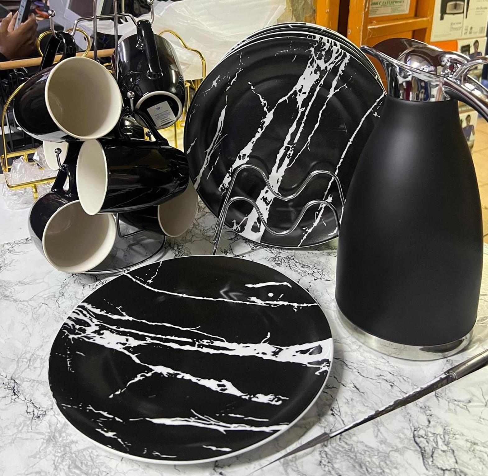 White/black 6 pcs plates,6 pcs mugs and black 2 ltr flask